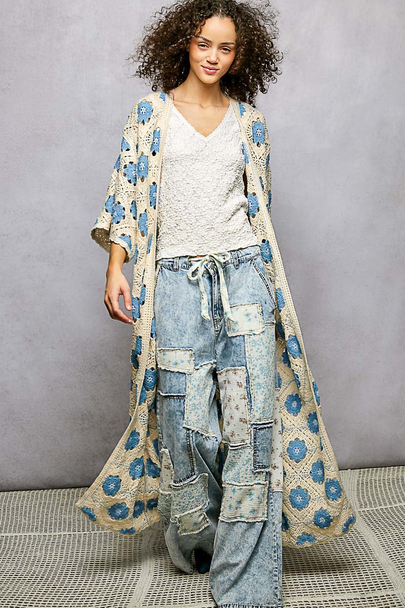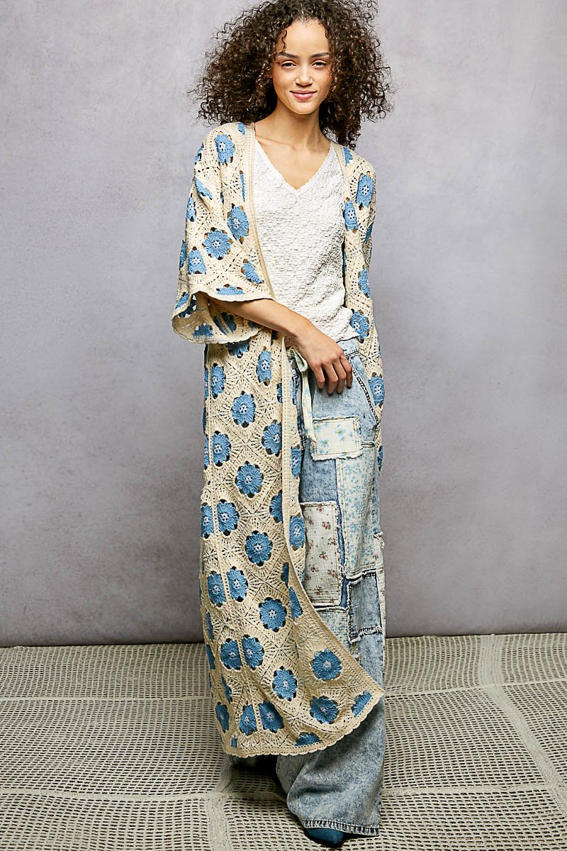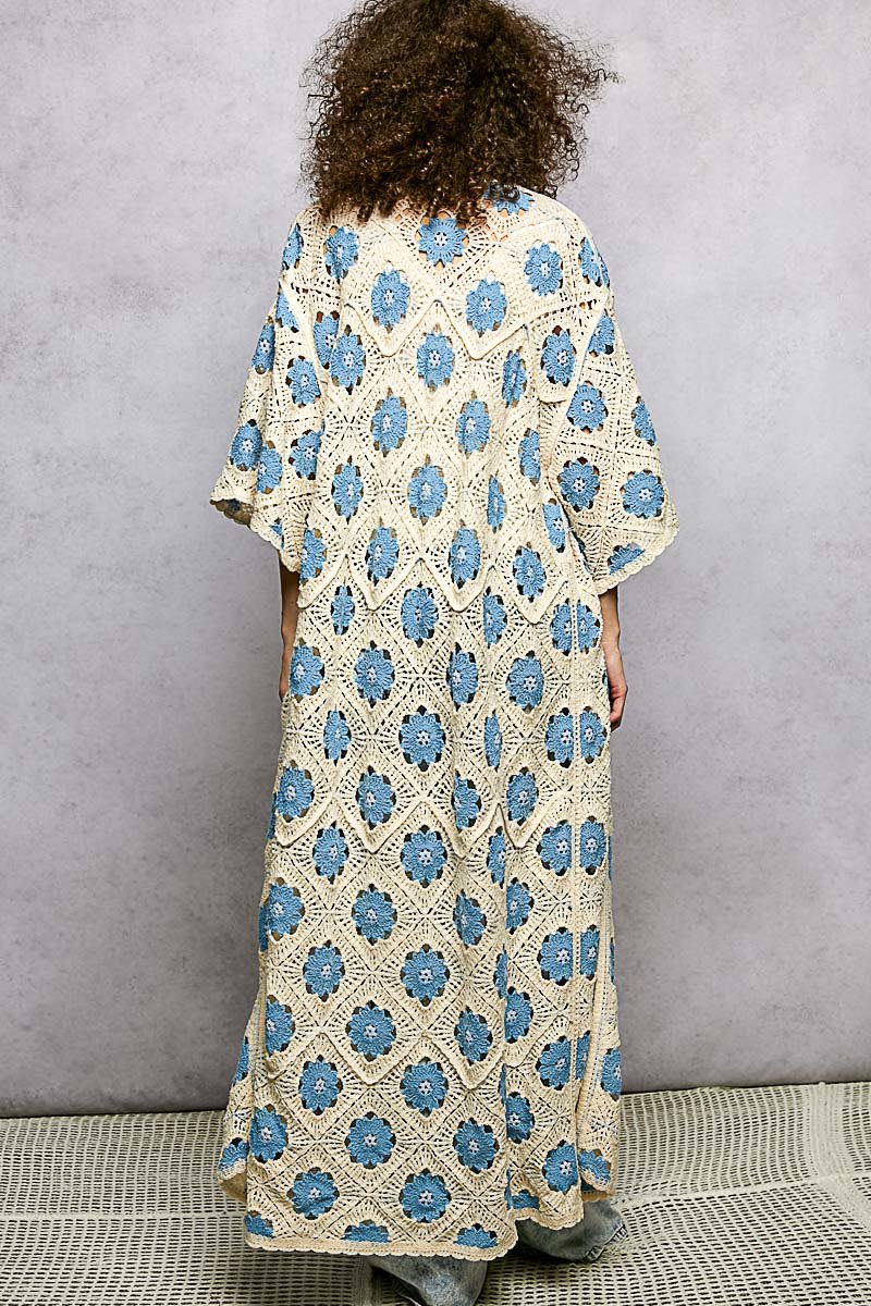 The 3/4 sleeve roomy fit cardigan in crochet is designed with a relaxed and comfortable silhouette, perfect for easy layering. The crochet construction features a floral pattern detail and border accents, adding a feminine and elegant touch to the piece. The 3/4 sleeves offer a stylish look while providing coverage and ease of movement. This cardigan is versatile and can be dressed up or down for various occasions. With its intricate crochet work and beautiful floral design, this cardigan is a lovely addition to your wardrobe for a chic and bohemian-inspired look.