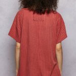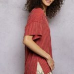 This top is designed with a V-neck and short sleeves, giving it a modern and chic look. The roomy fit offers a relaxed and comfortable silhouette for all-day wear. Made from textured knit fabric, it adds depth and interest to the piece. The extended back hem and exaggerated side slit detail add an edgy touch to the design. Pair this top with jeans or leggings for a stylish and contemporary outfit.