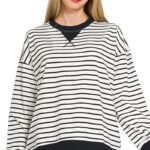 Cozy black-and-white striped sweatshirt with contrast ribbed trim.