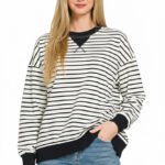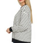 Refresh your everyday layers with this striped round neck sweatshirt in classic black and white. The contrast neckline and ribbed trim give it a sporty, modern finish that looks effortless with jeans, joggers, or leggings.