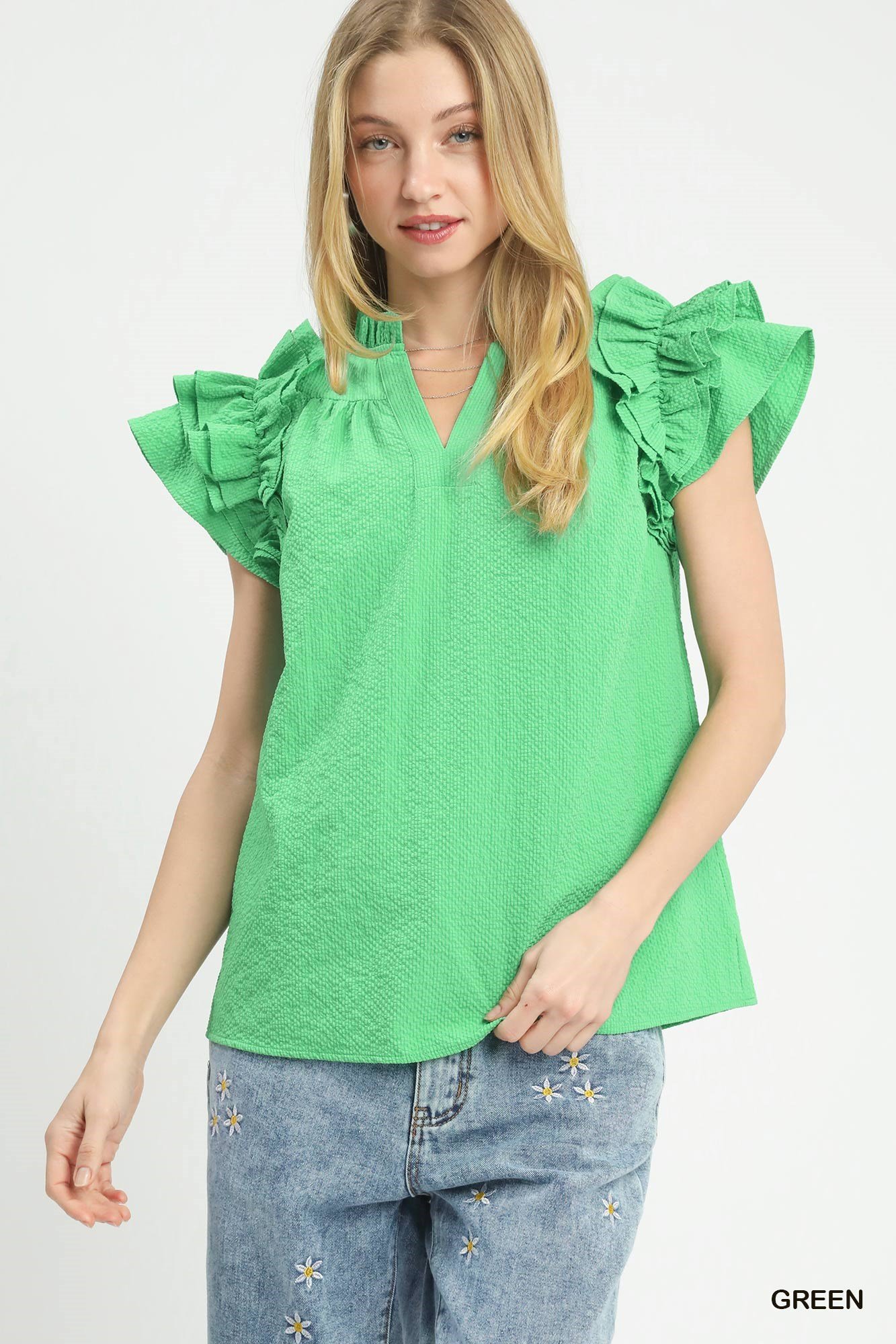 Add a touch of sophistication to your wardrobe with our Textured Ruffle Sleeve Notched Top. This chic blouse is designed to bring a fun and feminine flair to your look, making it the perfect choice for any occasion.
