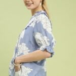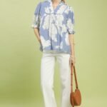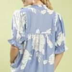 - Features: Scalloped trim, split V-neck, puff sleeves