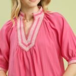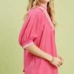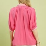 Women’s Pink Contrast Trim Pleated Top with Lace Details